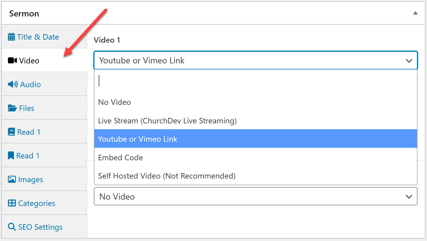 - Youtube or Vimeo link - This is the default option. Just paste in the link to the video on youtube or viemo and the site will get the embed code automatically and embed the video directly on the sermon page.