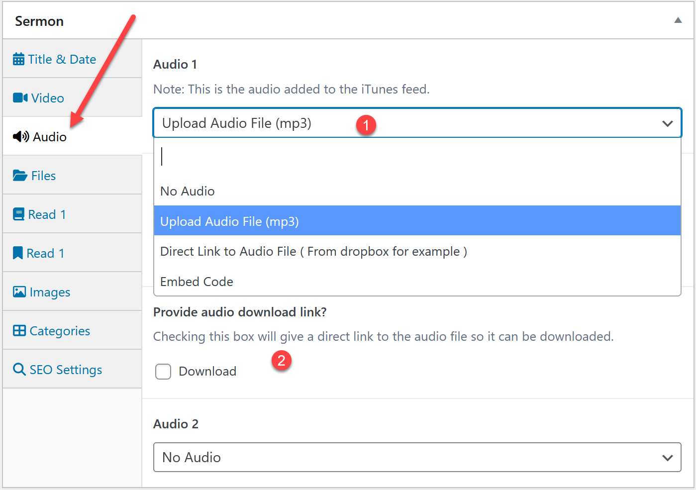 Each sermon can have up to two audios. The audio buttons can be renamed at sermons > sermon settings on the button text tab. So if you add two you can rename the buttons so people know what each audio is.