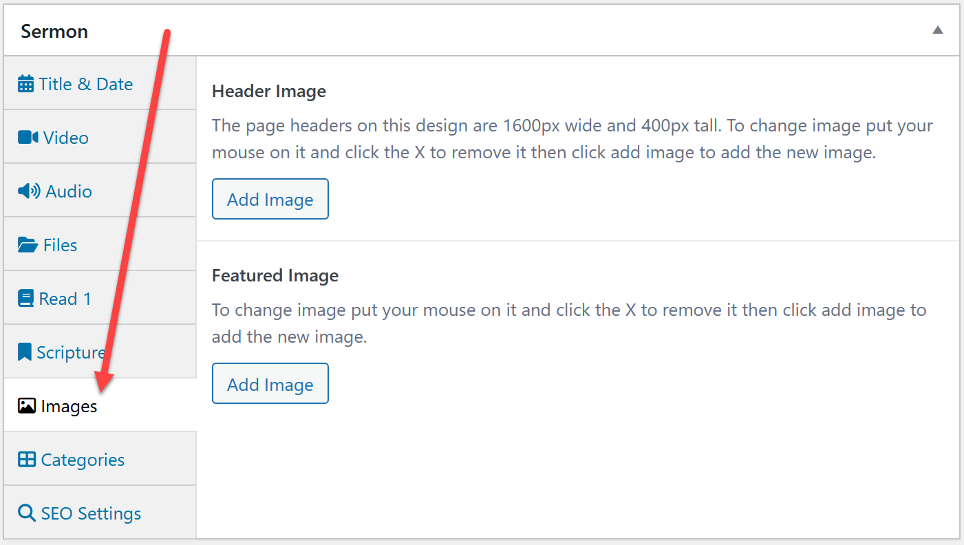 Featured image - The featured image is the image that shows with the sermon on the sermons page. By default it'll show the featured image set at sermons > sermon settings.