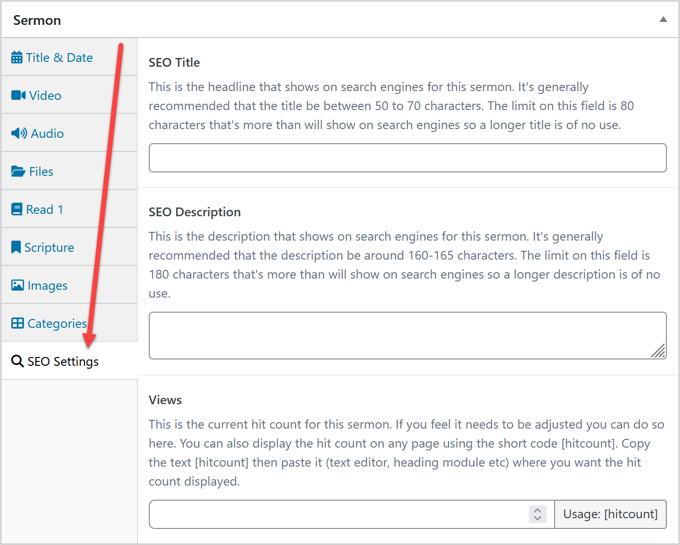 You can also reset the hit could here as well. If you'd like to show the hit count on the sermon, use the [hitcount] code. Add that in the read section, and it will display the number of hits/views where you place the code.