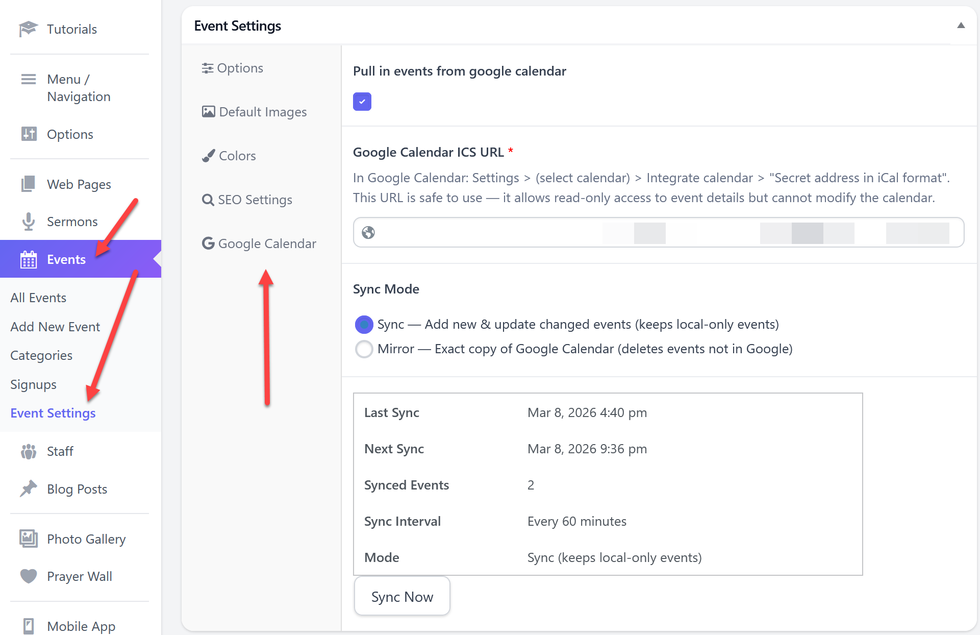 You can choose to have imported Google Calendar events display alongside events added directly to your website, giving you the flexibility to manage events from either location.
