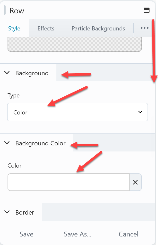 In the row settings window, scroll down looking for the background options. If you want a solid background color choose color for the type then below that select the background color you like.